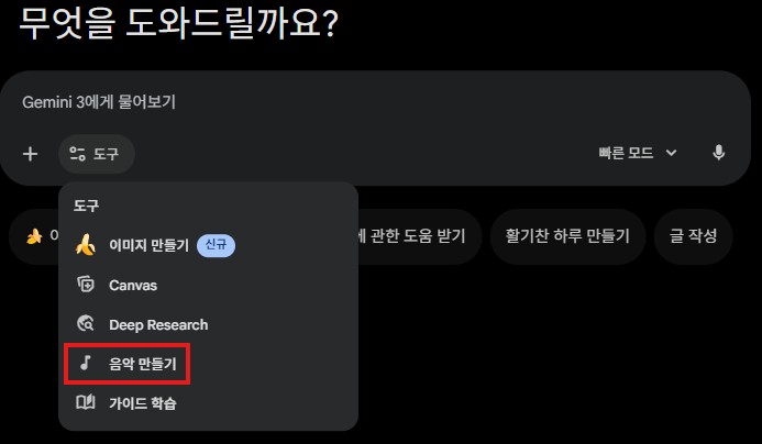 - 제미나이 앱 하단의 '음악 생성' 도구 클릭
