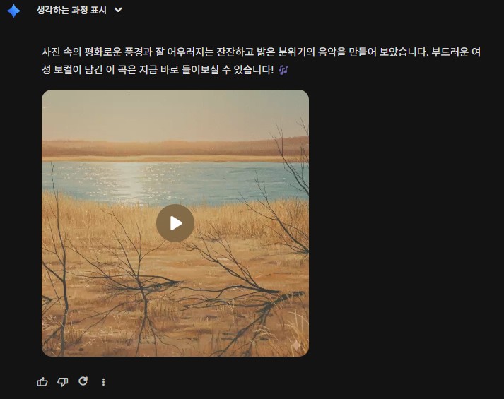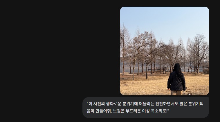 3. 프롬프트 입력: "이 사진의 평화로운 분위기에 어울리는 잔잔하면서도 밝은 분위기의 음악 만들어줘, 보컬은 부드러운 여성 목소리로!" |