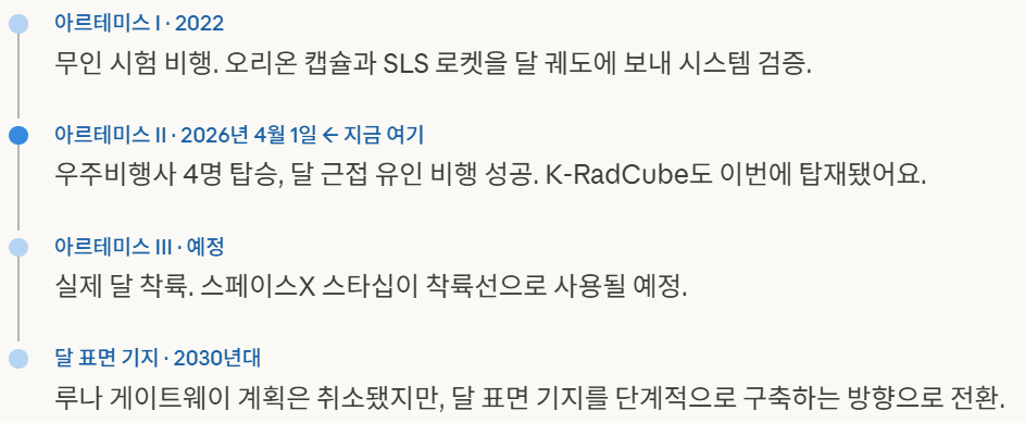 그런데 이번은 '다시 달에 간다'는 상징 그 이상입니다. 아르테미스 프로그램이 목표로 삼는 건 달 착륙을 넘어 달에 지속적으로 머무는 것이에요. 아르테미스 II는 그 로드맵에서 유인 비행 검증 단계입니다.
